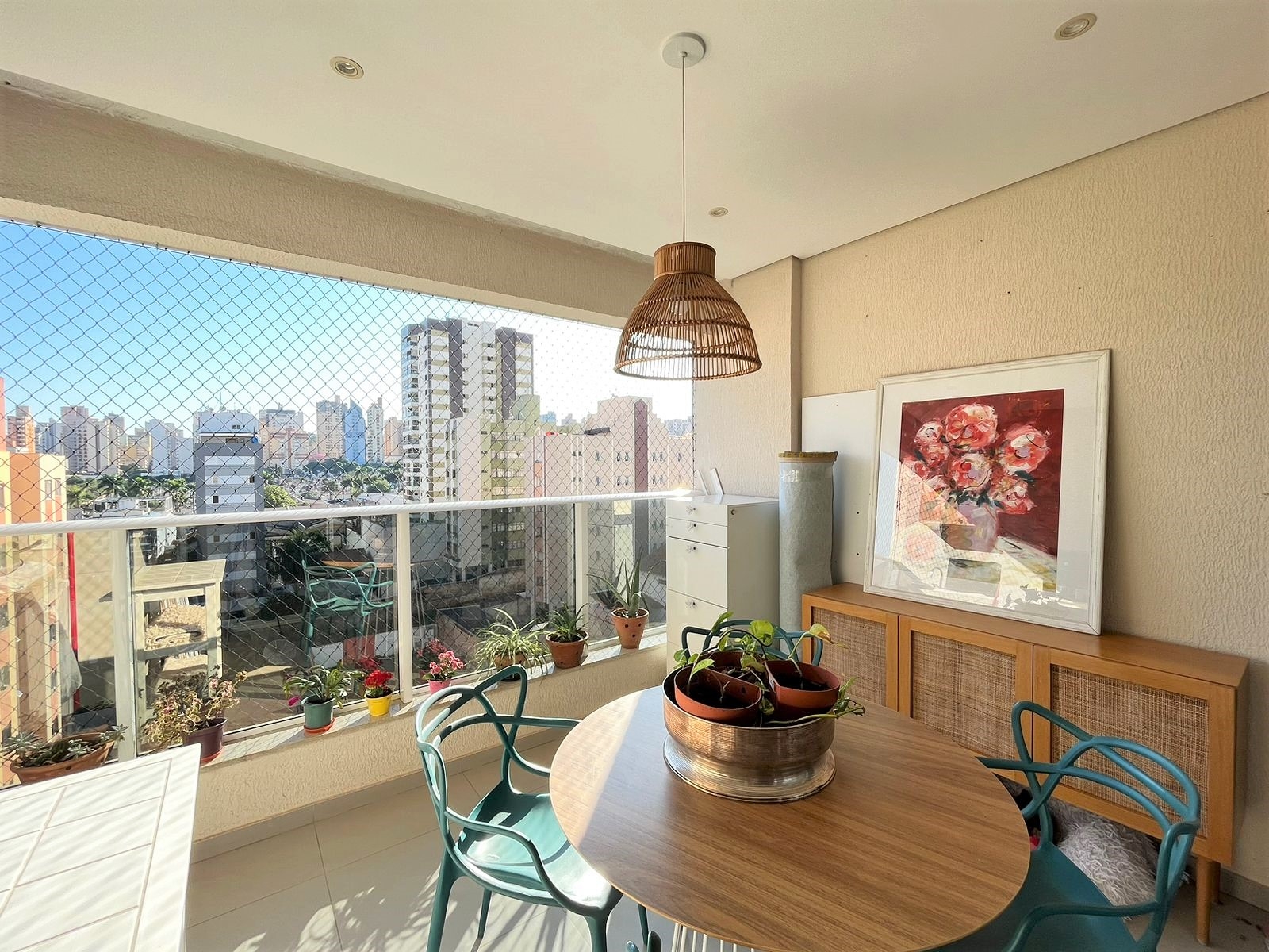 Sacada com churrasqueira e tela de proteção, perfeita para momentos de lazer.