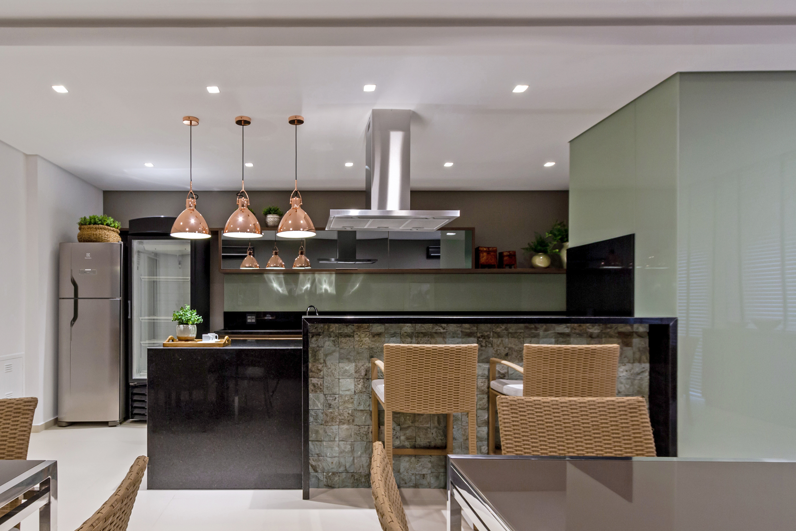 Cozinha equipada com cooktop, forno e coifa;