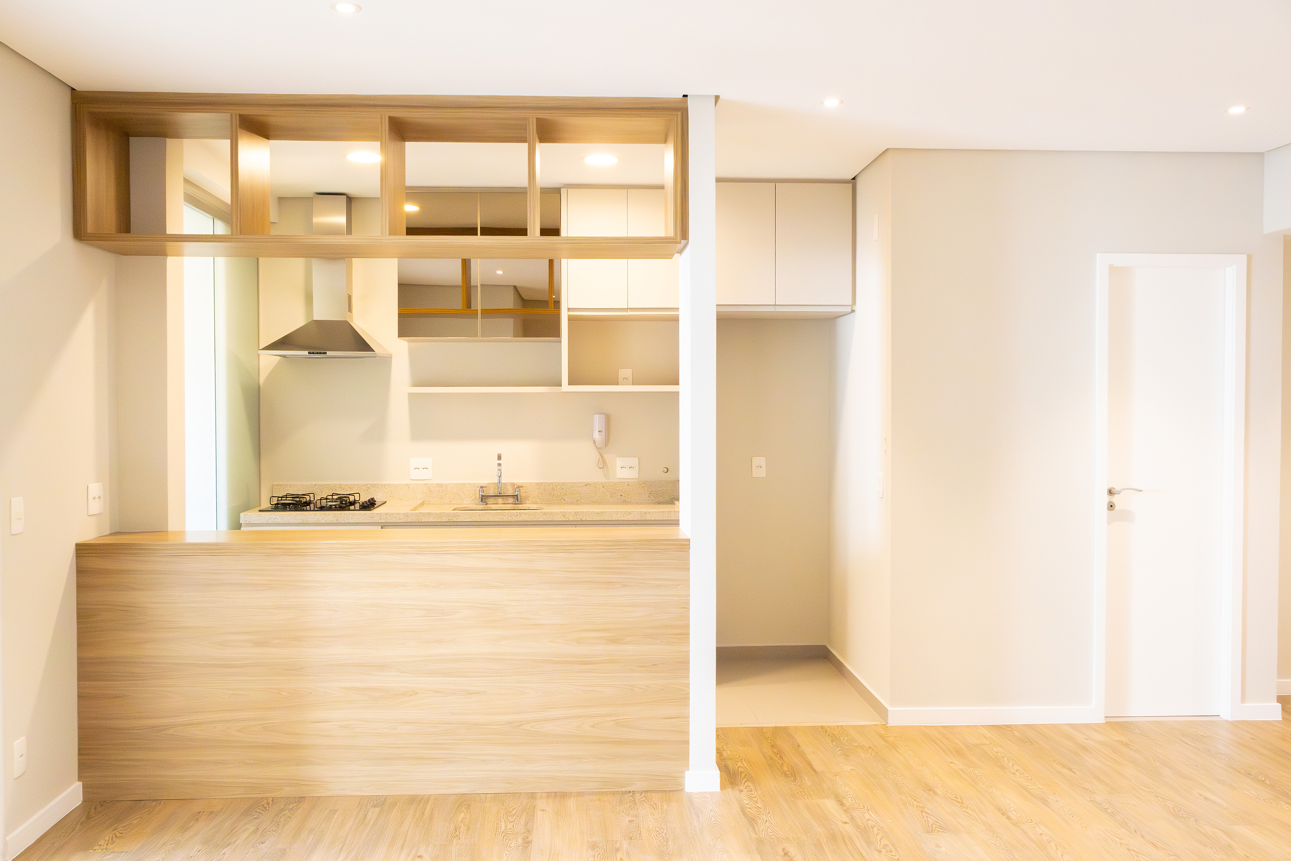 Cozinha equipada com cooktop e coifa;
