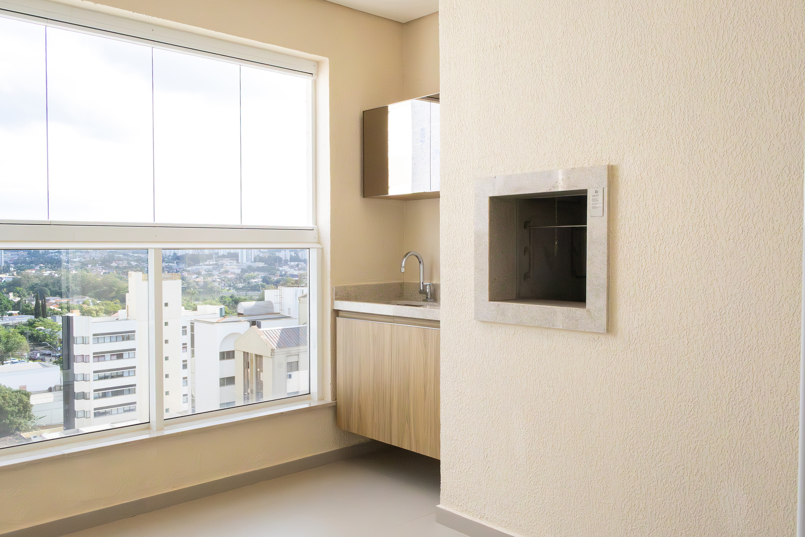 Sacada com churrasqueira e fechamento em screen glass;